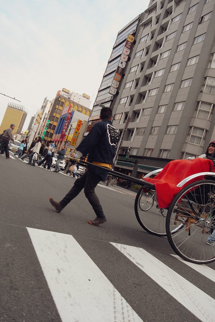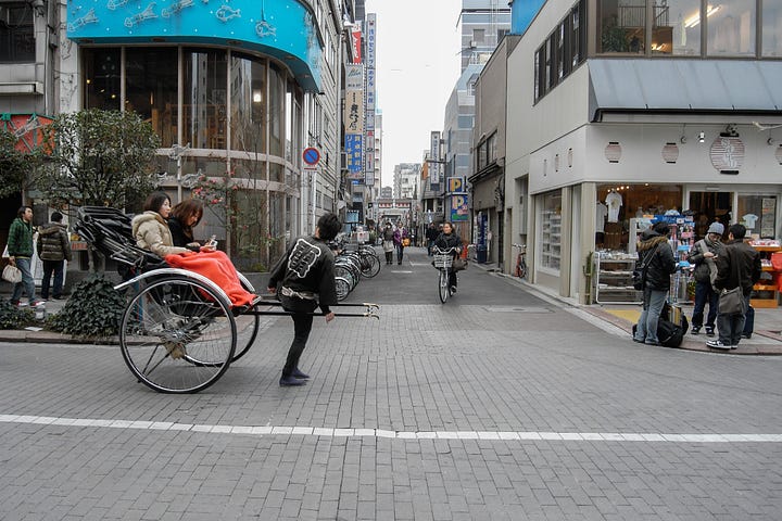 You can see many rickshaws carrying tourists in Asakusa. The rickshaw man explains the town with humor.