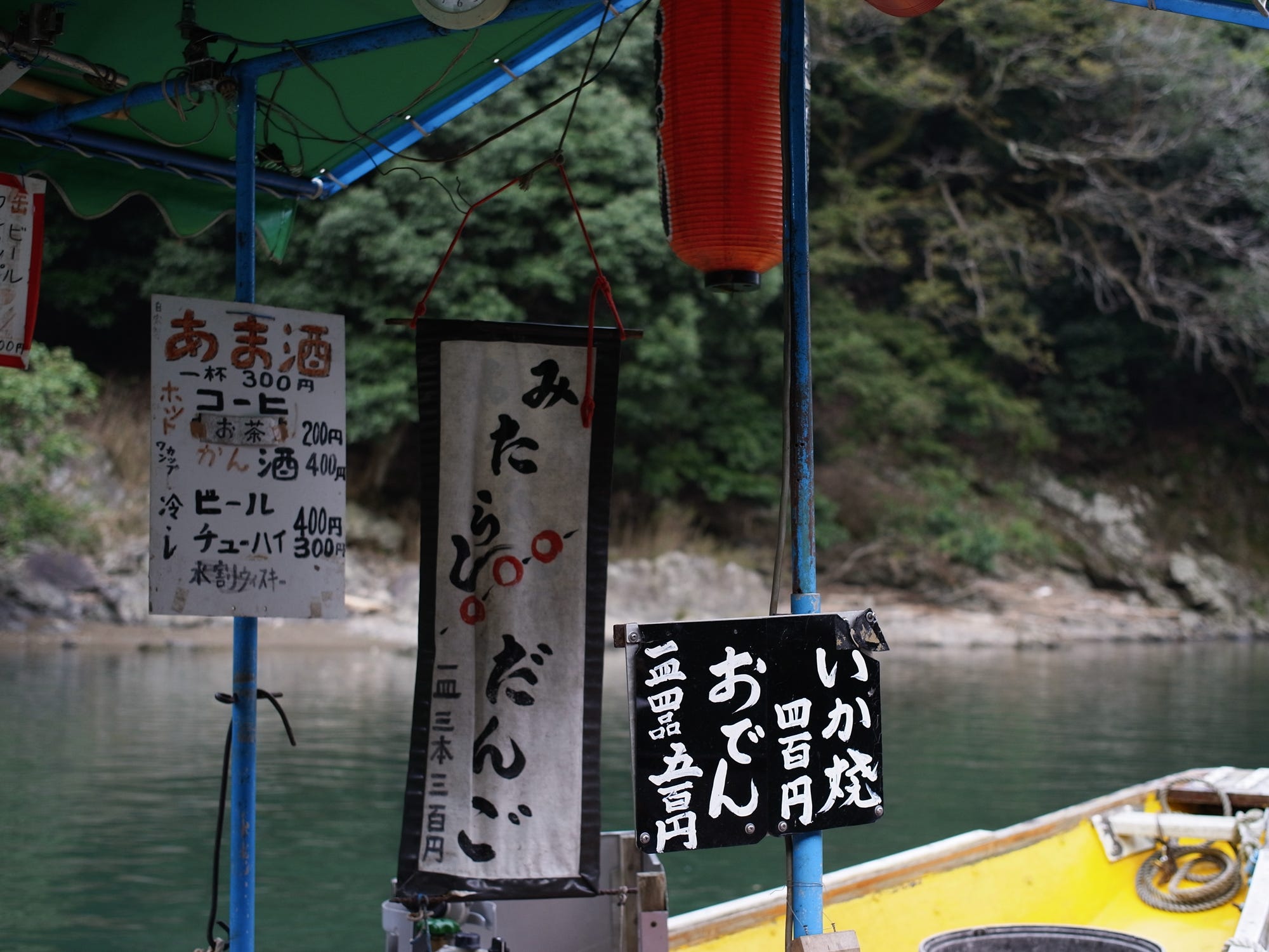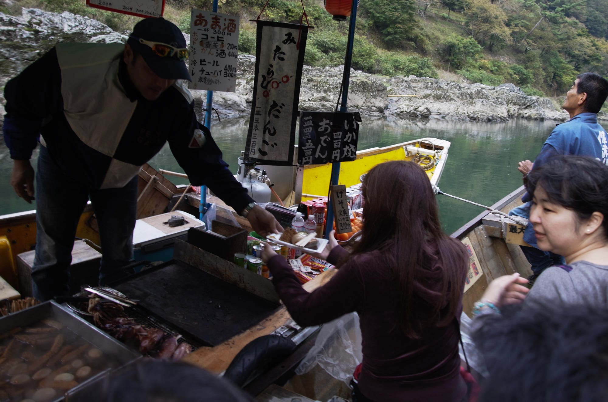 A boat selling food is waiting in the middle of the river, so if you buy food and alcohol there (For example: grilled squid, oden, mitarashi dango, snacks, coffee, green tea, amazake, beer, chuhai, sake, whiskey, etc.), you can eat and drink on the boat.