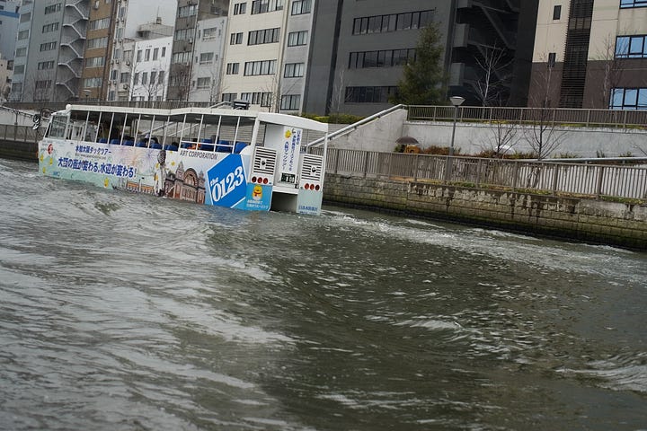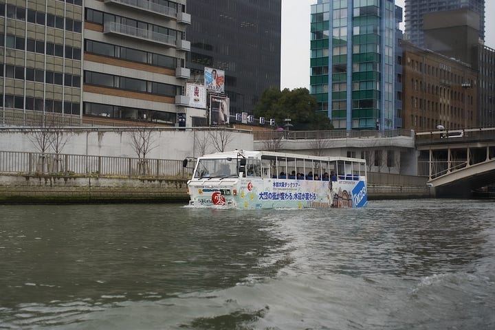 Amphibious sightseeing buses also operate. When the tide is high, the roof of the pleasure boat is lowered and the boat goes under the bridge.